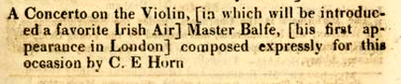 On the death of his father early in January 1823, Balfe left Dublin for London where he took music lessons with Charles Horn (1786-1849) and Horn's father "Carl Frederick Horn (1762-1830). During this time he also participated in selected concerts as a soloist on the violin.  His first concert was in 1823, at Drury Lane when he performed a concerto for violin.