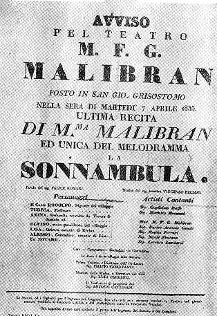 It was during this time she also agreed to sing a "benefit" performance of Bellini's La Sonnambula (with Balfe at Count Rodolfo and the tenor Lorenzo Bonfigli as Elvino) at the Teatro Emeronittio for the manager, Gallo. To show his appreciation, Gallo renamed his Theatre "Teatro M. F. G. Malibran" (Maria Felicia Garcia-Malibran) in recognition of her generosity. This turned out to be a sensational performance, with Malibran receiving over 30 curtain calls.