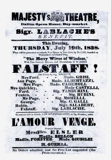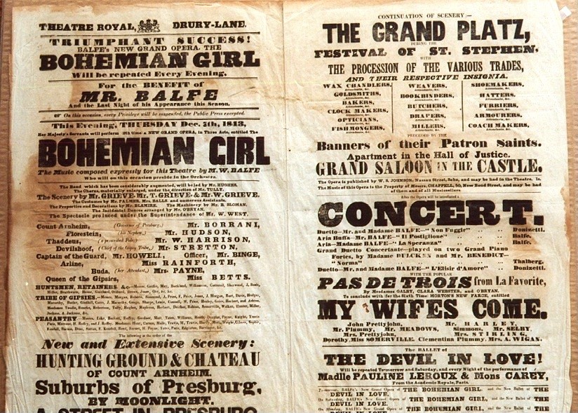 The Playbill for Balfe's most famous opera, The Bohemian Girl which premiered at the Theatre Royal Drury Lane, in November 1843.