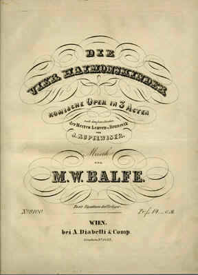 Balfe's relatively unknown international musical fame and foreign language operas which had their premieres or early performances in cities such as, Paris, Vienna, Milan, Palermo, Trieste, Berlin, Leipzig, Frankfurt, Munich, Madrid, Lisbon, Brussels, London, Dublin, New York, Boston and San Francisco are detailed here for the first time in the following, along with score locations. Click on: