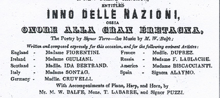 Balfe and his new wife, Lina Roser-Balfe were both in the Milan area during such historic moments, as the premiers of Bellini's Norma (December 1831) and La Sonnambula (March 1831), and possibly, Donizetti's Anna Bolena (December 1830).