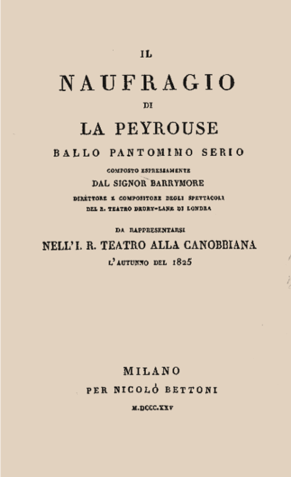 While in Milan in the summer of 1825 Balfe was given an assignment to compose the music for a "Ballo Pantomino Serio" by the Director of the Teatro Canobbiana, an Englishman by the name of Joseph Glossup (1793-1850).  The Ballo Pantomino was called, Il Naufragio di La Peyrouse by William (Blewit) Barrymore (1759-1830) of the Theatre Royal, Drury Lane, London.